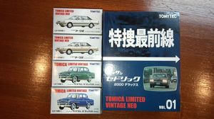 トミカリミテッドヴィンテージネオ・・LV-N98トヨタ マークU グランデ(aホワイト、bホワイト/ベージュ) 1700円、特捜最前線01 セドリック2000デラックス 2400円。
