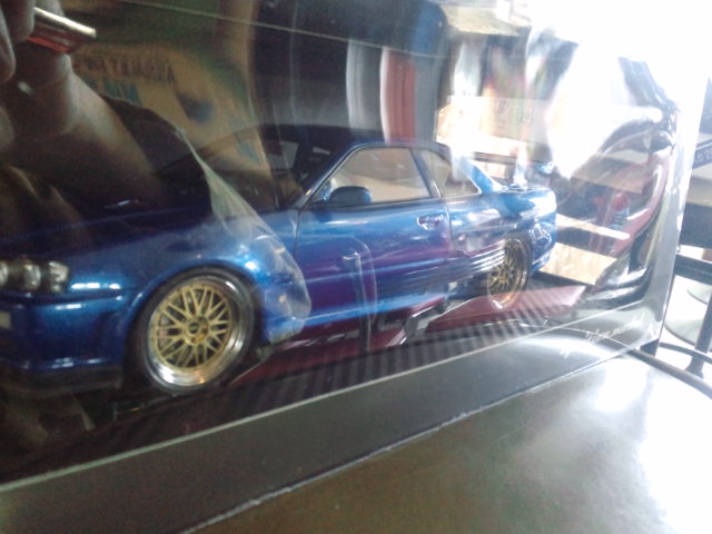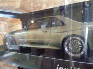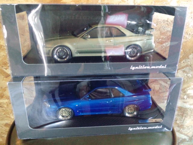 イグニッションモデル1/18・・スカイラインGT−R Vスペック2 R34(ミレニアムジェイド、ブルー) 各19800円。