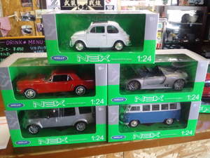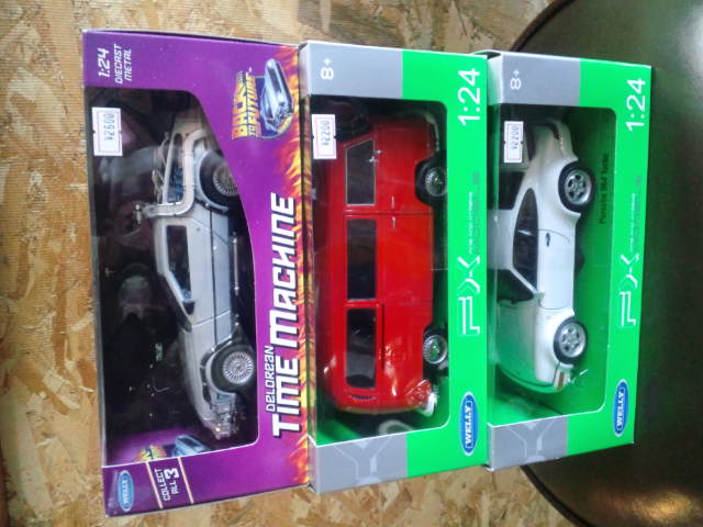 ウィリー1/24・・1964マスタング、1957フィアット500、1963VW T1バス、ポルシェ918スパイダー 各2200円、ランドローバー ディスカバリー4 2400円。
